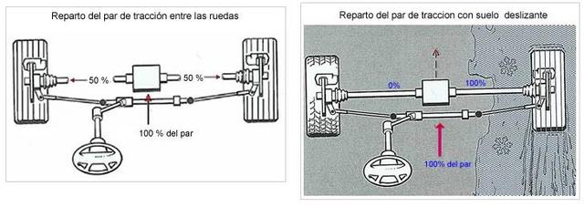 No obstante, los diferenciales tienen un defecto incómodo y desgradable. Cuando pierde adherencia una rueda motriz automáticamente absorve toda la energía del motor, debido a que envía mayor potencia a la que menos fuerza opone. Pensemos en un coche de tracción delantera en el que una rueda está patinando o al aire y la otra tiene buen agarre. Pues en este caso el vehículo se quedará clavado y no avanzará debido a que todo la tracción del motor se envía a la rueda que patina, mientras que la que tiene adherencia carece de fuerza.